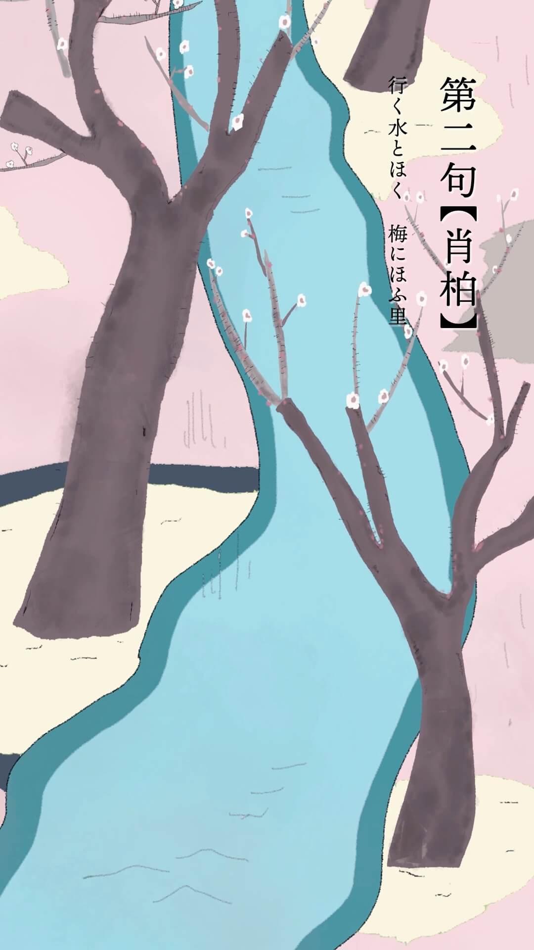 室町時代の連歌「水無瀬三吟百韻」は3名の歌人が百句を連綿と繋げていく様式を持っている。この連歌では句ごとに四季が移ろっていく。それを縦長イラストのスクロールによって可視化し、詩にメロディをつけることで可聴化した。古典に苦手意識を持つ人でもスマートフォンを用いて楽しみながら学べる映像コンテンツを制作した。