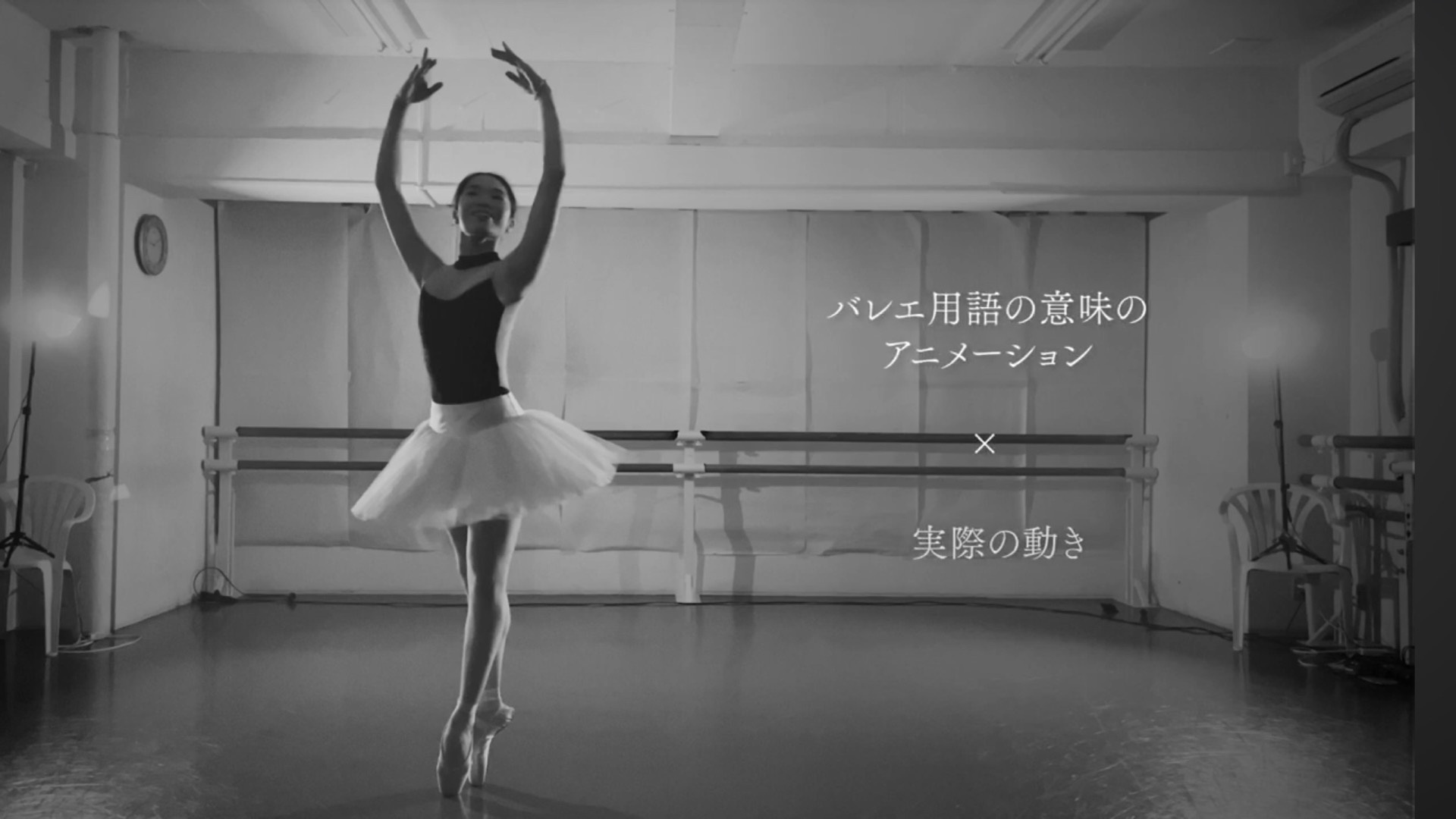 アニメーション化したバレエ用語の意味と身体動作を重ね合わせた映像作品を制作した。日本のバレエ指導は、資格を必須とせず指導者の経験に依存している場合がある。本作品は、バレエ学習者が如何なる指導に左右されず、バレエ用語のを正しく理解し、身体動作の特徴を掴むことを目的とした。